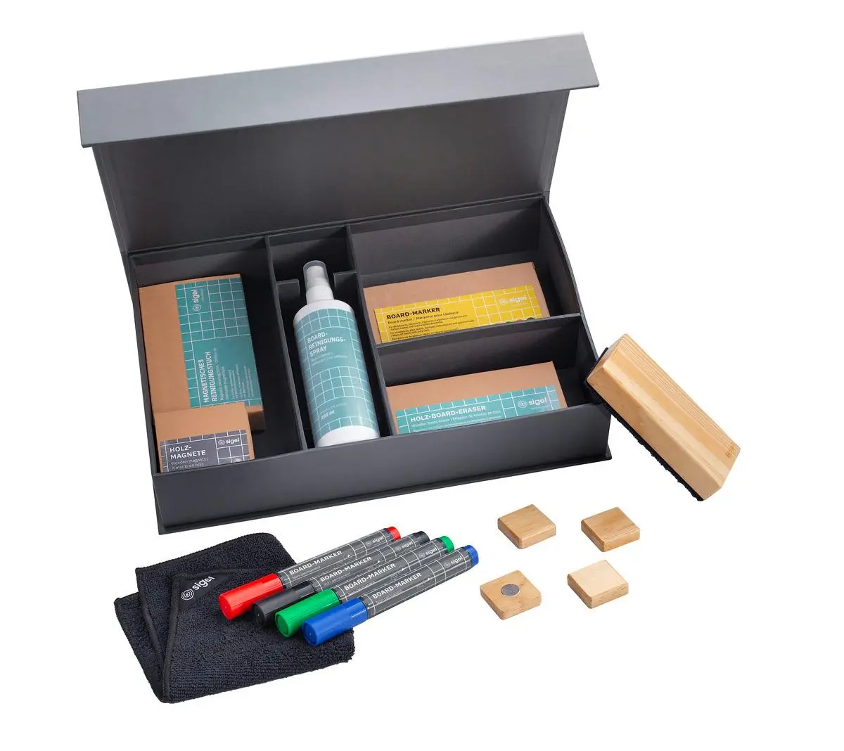 Set uključuje 2 velike bijele ploče (900 x 1800 mm), mobilni stalak na kotačićima i kompletan početni set za rad. Ploče su magnetske, statički ljepljive te pogodne za pisanje nepermanentnim markerima uz jednostavno brisanje (suho i mokro).