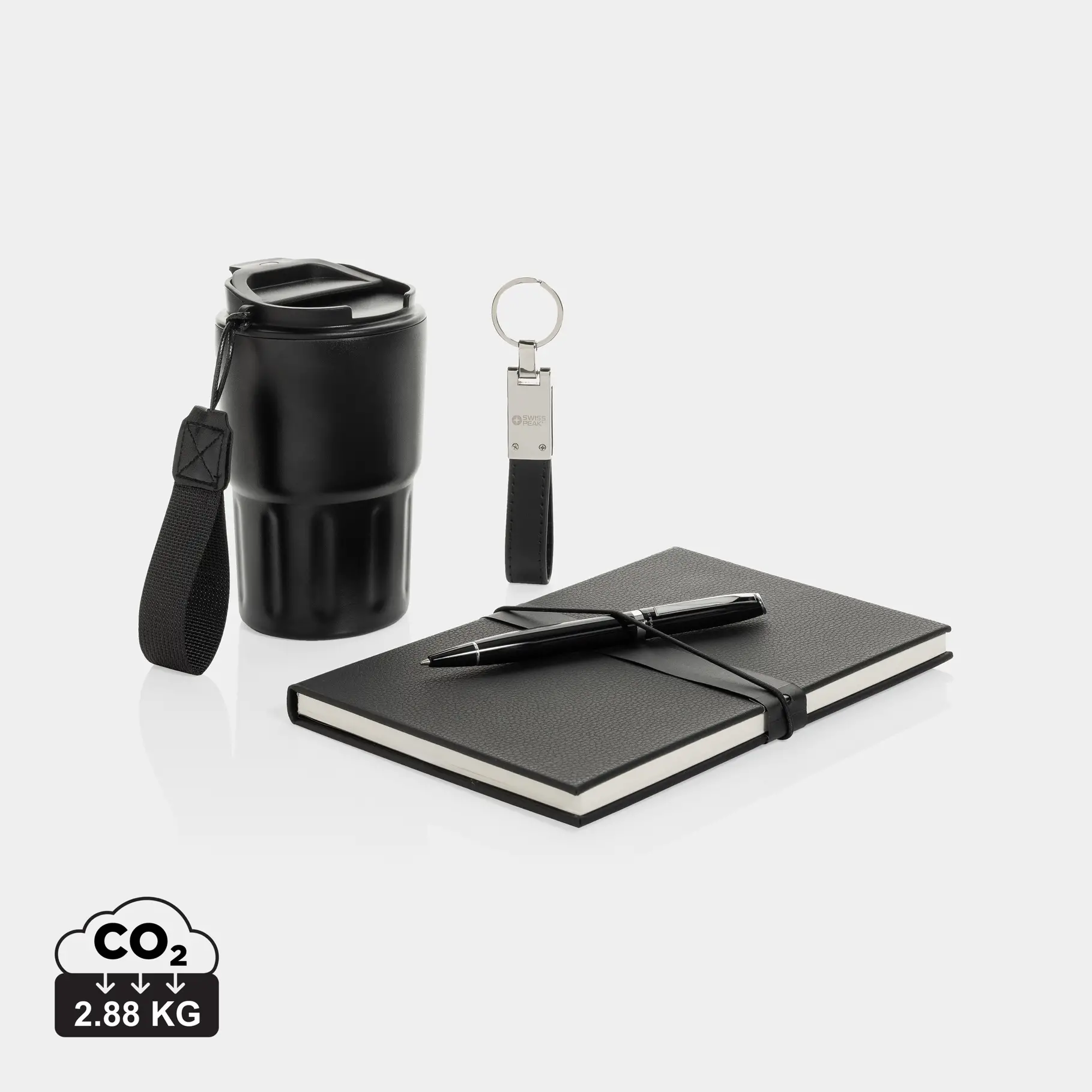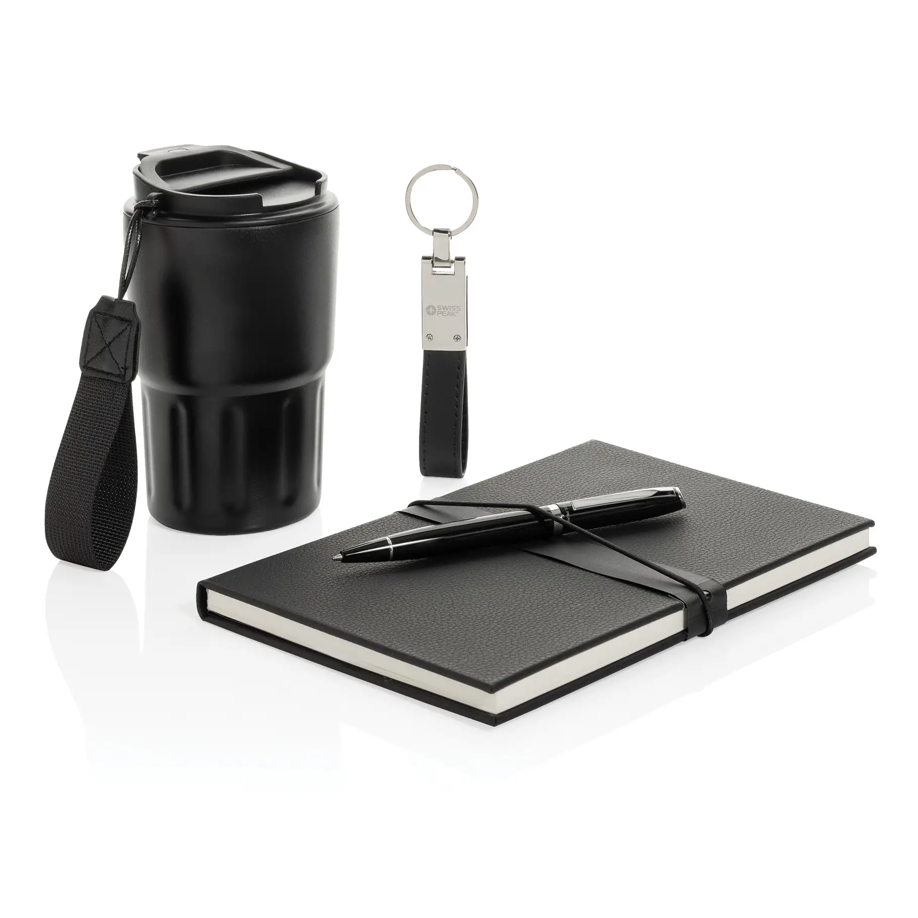 Za ključeve koji su uvijek pri ruci tu je premium Swiss Peak privjesak s elegantnim metalnim sjajem i PU kožnom trakom. Set dodatno upotpunjuju poslovna kemijska olovka s kapacitetom pisanja do 1000 metara te soft-touch PU bilježnica izrađena od recikliranog poliestera, s 160 krem stranica od recikliranog papira.